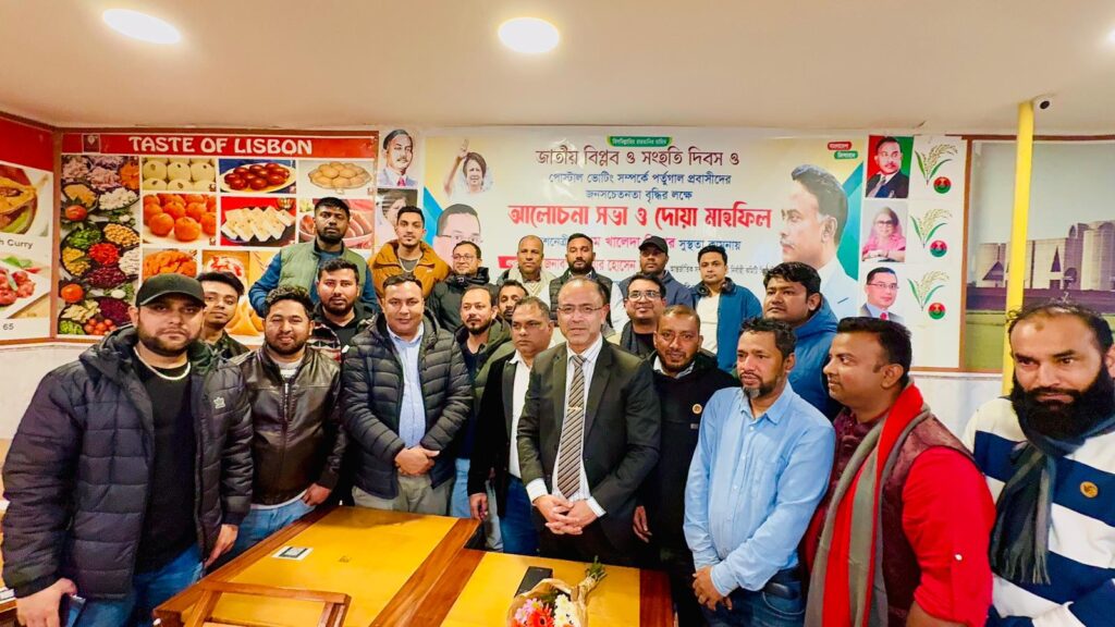 গত ৩০শে নভেম্বর পর্তুগাল বিএনপির উদ্দোগে লিসনের একটি হলরুমে আহবায়ক আবু ইউসুফ তালুকদার এর সভাপতিত্বে ও সদস্য সচিব ছায়েফ আহমেদ সুইটের সঞ্চালনায় পোষ্টাল ভোটিং সম্পর্কিত আলোচনা সভা এবং বেগম জিয়ার রোগ মু্ক্তির কামনায় দোয়া মাহফীল অনুষ্ঠিত হয়। এতে প্রধান অতিথির হিসাবে ছিলেন বিএনপির জাতীয় নির্বাহী কমিটির আন্তর্জাতিক সম্পাদক জনাব আনোয়ার হোসেন খোকন। প্রধান অতিথি বক্তব্যে বলেন জাতীয় বিপ্লব ও সংহতি দিবস বাংলাদেশীদের জন্য অত্যন্ত গুরুত্বপূর্ণ দিন, এই দিনের ইতিহাস আমাদের নবীনদের তুলে ধরা উচিত, কিন্তু আজ আমাদের প্রিয় নেত্রীর অসুস্থতার কারনে আমরা সবাই উদ্বীগ্ন উৎকন্ঠিত , সবার কাছে বাংলাদেশের তিন বারের প্রধানমন্ত্রী বেগম খালেদা জিয়ার জন্য দোয়া চেয়ে বলেন মহান রাব্বুল আলামিন যেন তাকে সুস্থ করে আমাদের মধ্যে নিয়ে আসেন।